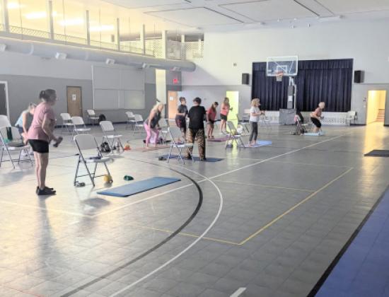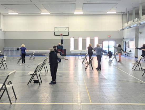 • This class includes exercises with weights, bands with movement in and out of a chair, and yoga stretching at the end.